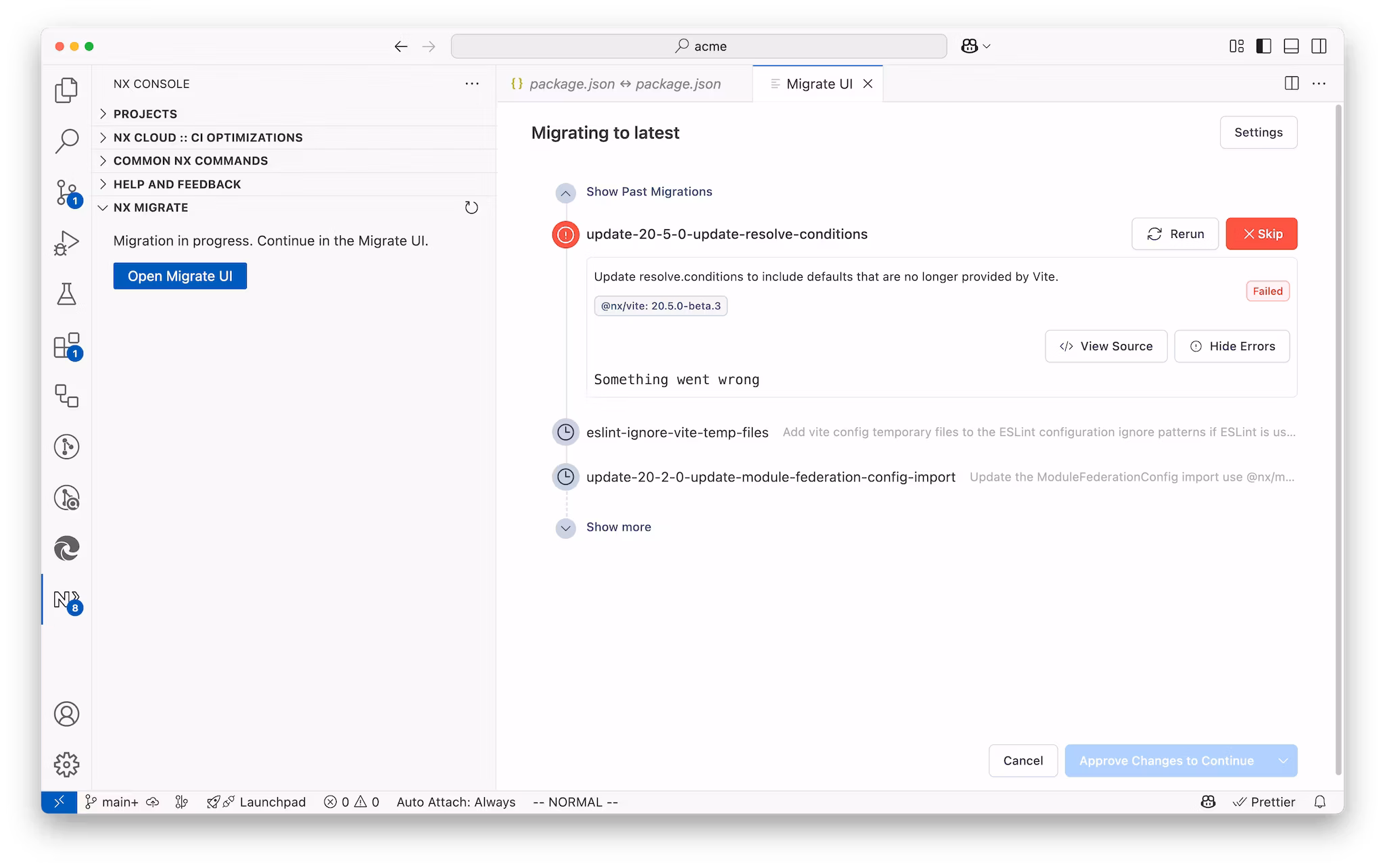 Once you start the migration, Nx Console runs the nx migrate command to update your dependency versions and generate a migrations.json file. You'll be prompted to inspect the changes made to your package.json before installing them and proceeding.
